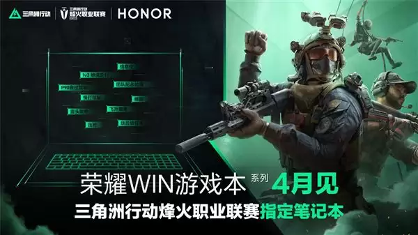 3月27日,随着《三角洲行动》烽火职业联赛春季赛的火热举行,荣耀与《三角洲行动》联合发布了宣传海报,荣耀WIN游戏本以“三角洲烽火职业联赛指定笔记本”的身份高调亮相,并且将于4月正式发布,以顶级战力