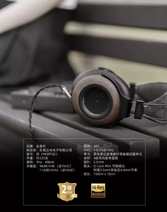该耳机整体重量约 300 克,搭配自适应弹性头梁和人体工学耳罩,采用北美黑胡桃木 CNC 精雕外壳,搭载 50mm 超薄碳纤维振膜 + 柔性 PU 悬边,配有高磁通量磁路系统,耳机同时采用可换线设计(双 3.5mm 接口),标配高纯度单晶铜线材。