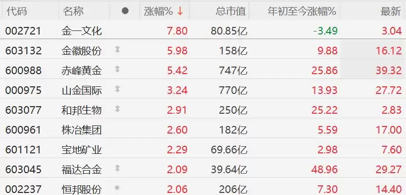 A股黄金概念普涨,赤峰黄金涨幅超5%领跑