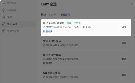 提示:微信ClawBot 接入无需填写App ID、App Secret等开发凭证,只需扫码即可完成绑定。