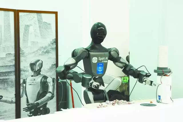 而更大的惊喜来自休息区。这里有一家机器人餐吧,不同型号的机器人各司其职,实现了无需人工干预的闭环服务:从顾客扫码点餐开始,餐台后的机器人便会根据订单自动制作糖葫芦、果茶或咖啡,送至吧台后,再由专门的“店小二”夸父机器人将茶点送到取餐点。这种无人餐吧的背后,依托于一个统一的“机器人大脑”进行全局任务理解、动态拆解与多机调度,它能将复杂餐饮服务流程拆解为多个子任务,并在不同机器人之间动态分配与调度。