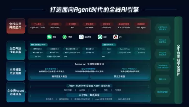 3月27日,2026腾讯云城市峰会首站落地上海。继ToB业务实现全年规模化盈利后,腾讯云公布2026年AI演进路线:首次发布涵盖基础设施、模型、生态到应用的Agent产品全景图,将MaaS平台升级为TokenHub,推出企业级Agent治理方案,底层平台Cube全面开源,进一步夯实面向AI Agent时代的全栈工程能力。同时,腾讯开放了涵盖自研Skills、开源SkillHub、微信、小程序、企微、元宝、QQ等在内的丰富技能生态,展现出在AI应用场景中的独特优势。