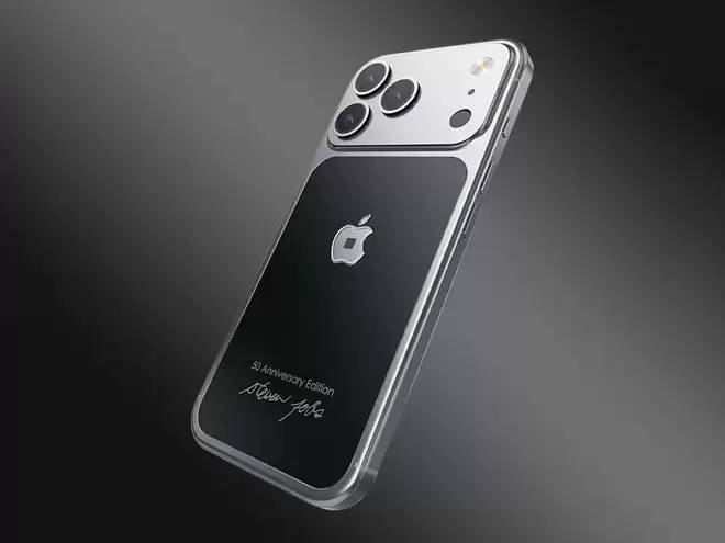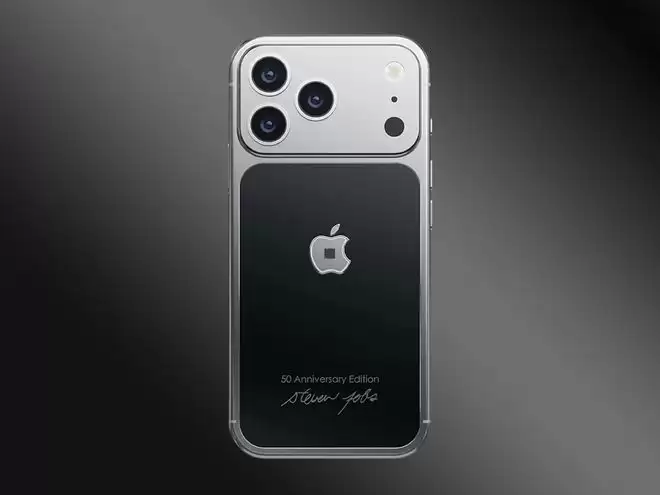 外观方面,这款定制版为致敬初代 iPhone,采用经典的黑银双拼配色,底部还刻有“50 周年纪念版”字样,并精准复刻了乔布斯的亲笔签名。