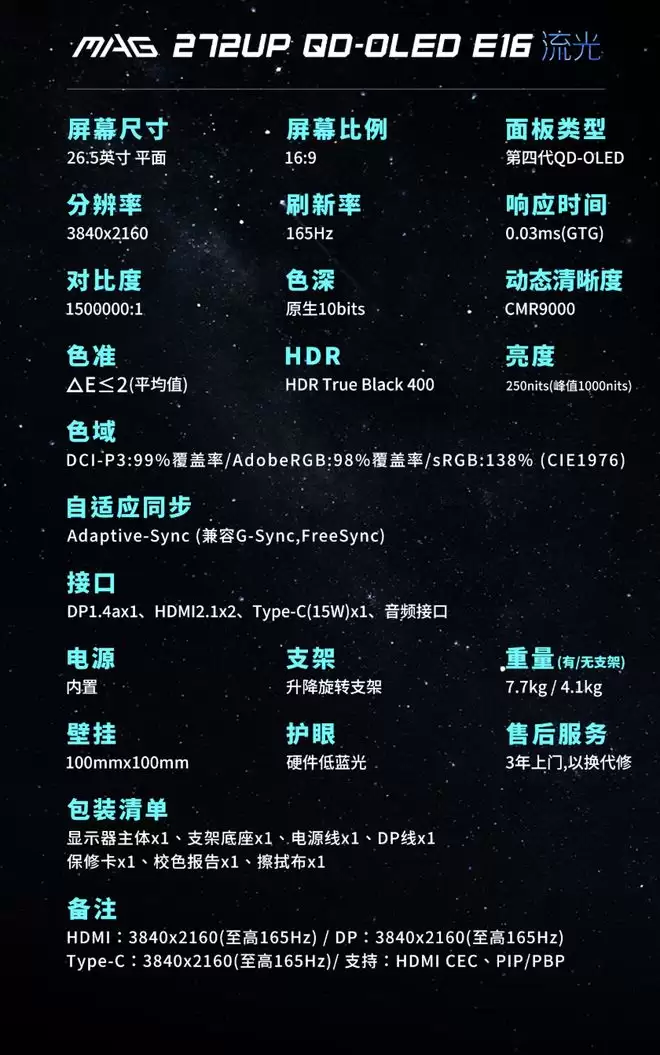 该机配备一块 3840x2160 分辨率 165Hz QD-OLED 四代面板,SDR 亮度 250 尼特,HDR 亮度 1000 尼特,支持 10-Bit 色彩,覆盖 99% DCI-P3 和 98% Adobe RGB 色域。