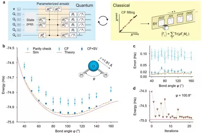 他们在两个逻辑量子比特上进行“变分量子本征求解”算法运算,值得关注的是,与理论值相比,在计算水分子电子基态能量方面的结果只存在 20 毫哈特里(mHa)的误差值。这种精准的计算潜力,为未来达到化学精度奠定了基础。