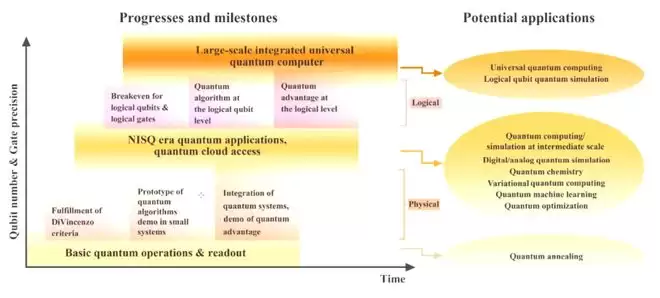 研究团队在此前发表于 Frontiers of Physics 的一篇综述论文中提到 [3],量子计算分多个阶段,此前的工作多数集中在物理层面,包括基本操作、读出等;现阶段是含噪声中等规模量子计算(NISQ,Noisy Intermediate-Scale Quantum);再往后是向大规模逻辑比特、逻辑运算推进,比如逻辑比特的盈亏平衡点、逻辑量子计算的优势验证等等;最终阶段则是具有实用价值的大规模容错量子计算。