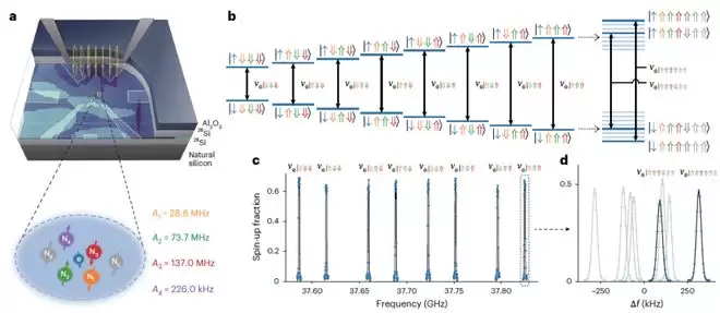 实验中,研究人员利用单电子自旋共振和单原子核的核磁共振技术,实现了对电子和核自旋的相干操作,并通过量子态层析成像技术验证了量子态的保真度。结果表明,Bell 纠缠态平均保真度可实现 93.4%,凭借实现高保真度的单比特和两比特量子门操作,进一步生成的四比特 GHZ(Greenberger–Horne–Zeilinger)态保真度达 88.5%,这一指标创造了硅基体系的新纪录,说明该处理器在操控多体量子纠缠方面具有强大的能力。