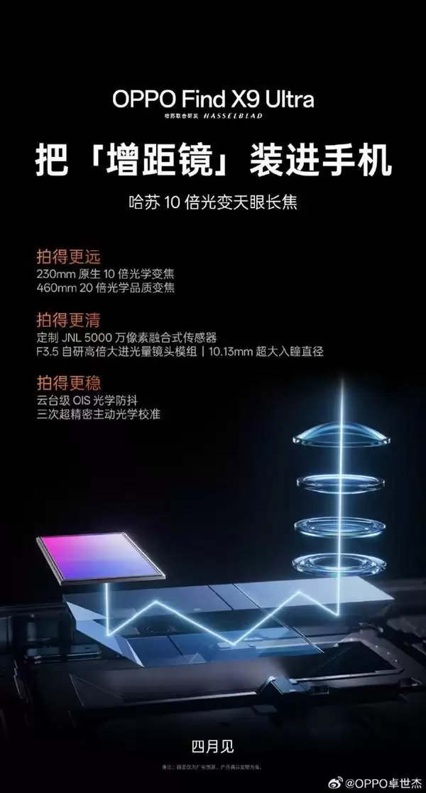 3月27日消息,围绕OPPO新一代影像旗舰Find X9 Ultra的爆料持续升温。今日,OPPO影像产品线负责人卓世杰在微博释放关键信息,确认该机将搭载行业“最大底、最大进光量”的3倍光学变焦镜头