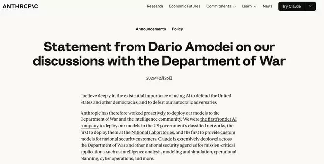 ▲Anthropic CEO达里奥·阿莫代(Dario Amodei)关于美国国防部的声明(图源:Anthropic)