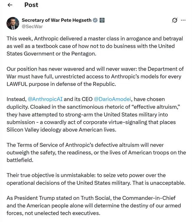 此前,Anthropic于2025年7月与美国国防部签署一份上限约2亿美元(约合人民币13.83亿元)的协议,Claude成为较早进入美军涉密网络的商业AI模型之一。双方围绕AI使用协议展开几次谈判,但最终破裂。美国政府于2月27日将Anthropic列为国家安全“供应链风险”并下令所有联邦机构停止合作。3月3日美国国防部长Hegseth在社交媒体X平台上发文,要求所有与军方合作的承包商和供应商停止使用Anthropic的产品。这些措施的接连落地,成为此次诉讼的直接触发点。