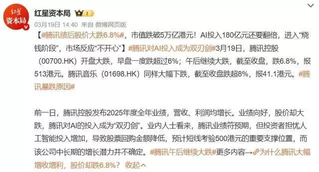 但相似的是,上述信息公布后,市场对巨头们的隐忧也随之浮现。反映在股价上,Meta、亚马逊等都曾出现短暂波动,而腾讯股价也在财报发布当日跌超4%、次日跌幅近7%。市场似乎已形成一种普遍认知,即AI投入与利润压力之间存在一种强相关。