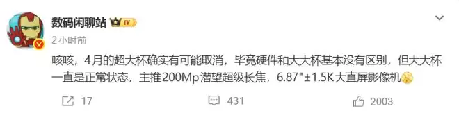 PChome 3月27日消息,据博主“数码闲聊站”爆料,某品牌将取消4月Ultra超大杯机型的推出,硬件配置与大杯高度重合,结合行业信息,该机型预计为华为Pura 90系列。爆料显示,华为Pura