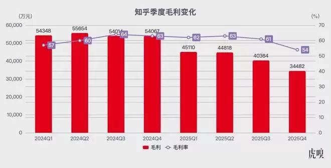 但撕开盈利的光鲜外壳,财报核心数据却难掩颓势:2025 年知乎全年营收 27.5 亿元,较 2024 年下滑 23.6%;三大核心业务全线收跌,营销服务收入同比下降 32.29%,付费会员收入同比下降 12.66%,其他收入同比下降 37.93%;全年毛利 16.48 亿元,较 2024 年下降 24.4%。