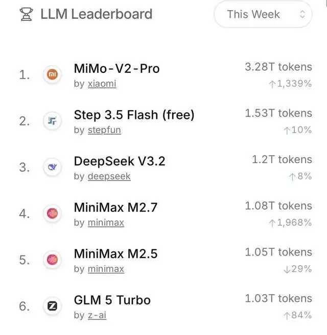 和罗福莉现身同步的是MiMo-V2-Pro近期在模型市场的火热表现。OpenRouter最新周榜数据显示,小米MiMo-V2-Pro模型拿下周榜第一,成为OpenRouter史上首个周Token消耗量超3万亿的模型。