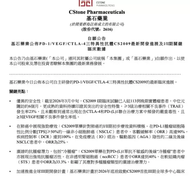 3月27日,基石药业-B大涨20.72%。消息面上,公司公布自主研发的PD-1/VEGF/CTLA-4三特异性抗体CS2009最新临床数据,在PD-L1 TPS≥50%的一线非小细胞肺癌患者中客观缓解率达90%,计划2026年底前启动Ⅲ期全球多中心临床试验。