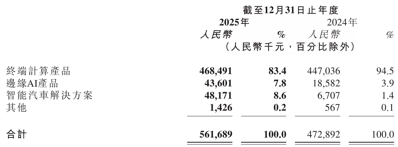 爱芯元智营收主要分为终端计算产品、边缘AI产品、智能汽车解决方案三部分收入构成,其中,爱芯元智2025年来自终端计算产品收入为4.69亿元,较上年同期的4.47亿元增长4.8%。