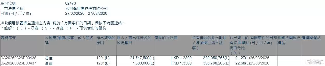 格隆汇3月27日丨根据联交所最新权益披露资料显示,2026年3月25日-3月26日,喜相逢集团(02473.HK)遭董事会主席、首席执行官兼执行董事黄伟在场内以每股均价1.33港元及1.23港元合计减持2924.75万股,涉资约2774.7万港元。