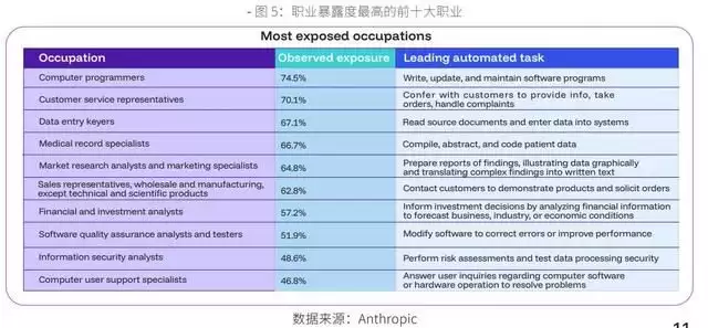 与此同时,AI 对传统岗位的冲击也日益明显。数据显示,计算机程序员、客服代表、数据录入员、市场研究分析师、金融分析师等职业,受自动化替代的 “暴露度” 位居前列,重复性执行、标准化分析类工作正被 AI 快速渗透。