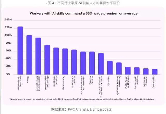 从行业看,批发零售、能源、信息通信领域的 AI 相关岗位薪资溢价尤为突出,其中,批发与零售业的薪资溢价约122%,能源业薪资溢价约100%,核心知识领域如金融、法律等岗位薪资差异平均达 56%。企业高薪争抢的,正是能够统筹 AI 工具、重构业务流程的复合型人才。