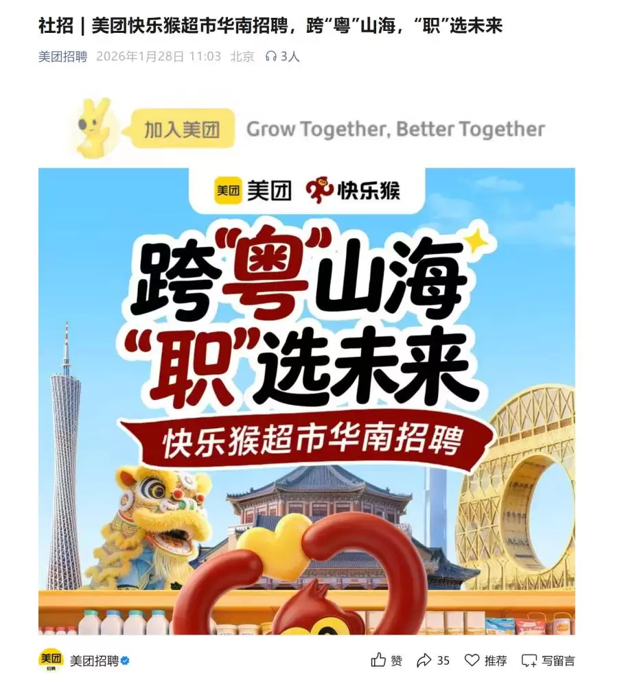 值得注意的是,快乐猴也在加速布局华南市场。据美团招聘最新公众号显示,美团快乐猴超市于1月28日开启华南市场招聘,覆盖门店拓展、门店运营、业务开发、商品采购、供应链五大板块,具体岗位包括选址拓展经理、店长、水果采购专家、3R采购专家等。