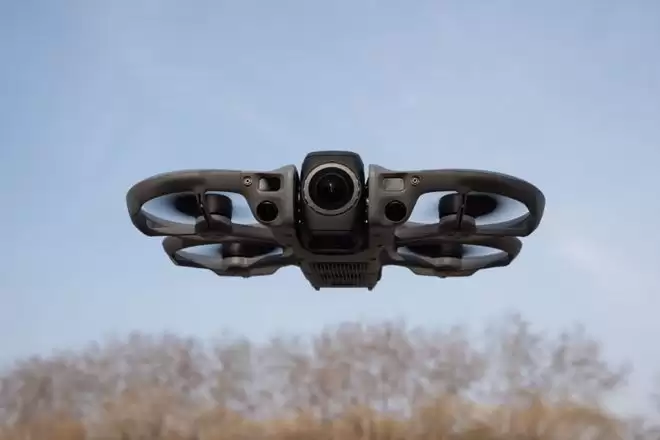 Avata 360 的全向避障系统支持 1 lux 暗光环境下工作,前向配备激光雷达,纯黑环境仍可识别前方障碍物并刹停。一体化全包桨保让机身可以贴近拍摄目标,骑行、车拍、人群环境里,周围的人也不会害怕。