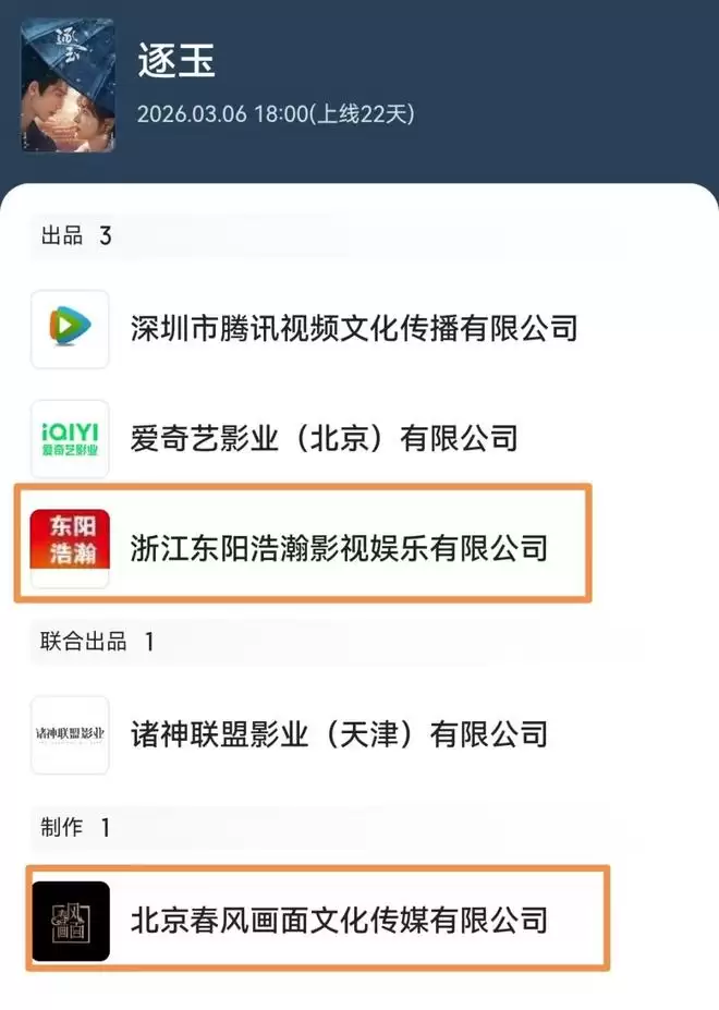这必定要涉及到投资方,《逐玉》的制作投资方里,一家是浙江东阳浩瀚影视娱乐有限公司,另外一家是北京春风画面文化传媒公司。