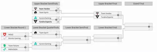ESL One伯明翰淘汰赛首日结束,Yandex战胜Spirit,Tundra击败Aurora,两支战队晋级胜者组决赛。
