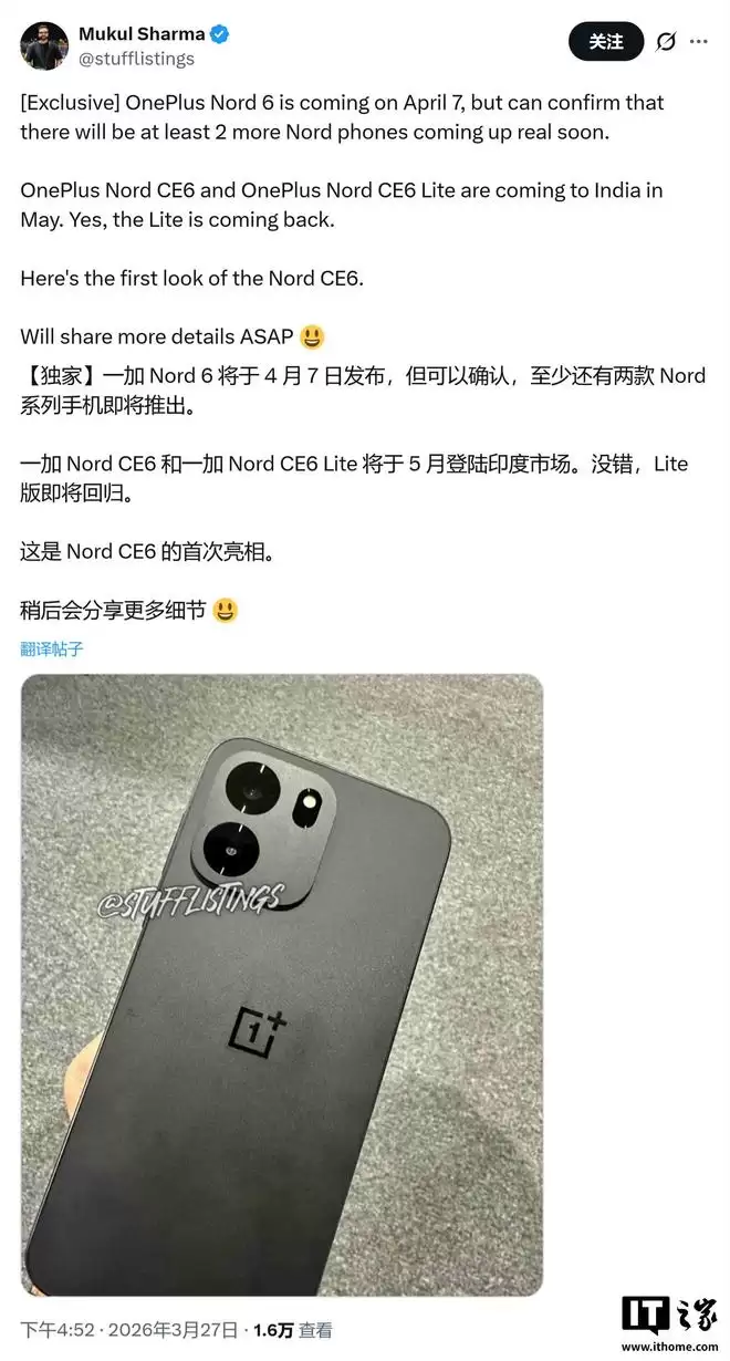 IT之家 3 月 28 日消息,消息源 @stufflistings 昨日(3 月 27 日)在 X 平台发布推文,分享了一加 Nord CE6 真机照片,该手机有望于今年 5 月发布。