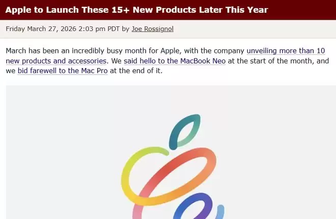 来源:环球网【环球网科技综合报道】3月28日消息,据外媒macrumors报道,2026年苹果产品布局持续提速,继3月连发十余款新品、调整Mac Pro产品线之后,公司下半年还将推出十五款以上全新及