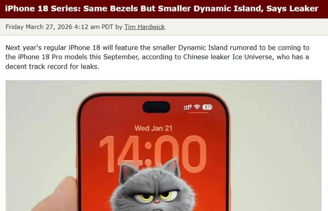 【环球网科技综合报道】3月28日消息,据外媒macrumors报道,iPhone 18日前被曝系列外观核心升级细节。消息显示,苹果将为全系iPhone 18配备尺寸更小的灵动岛。此前这项改动仅传闻专供iPhone 18 Pro机型,如今普通标准版也将同步跟进,实现全系统一优化。