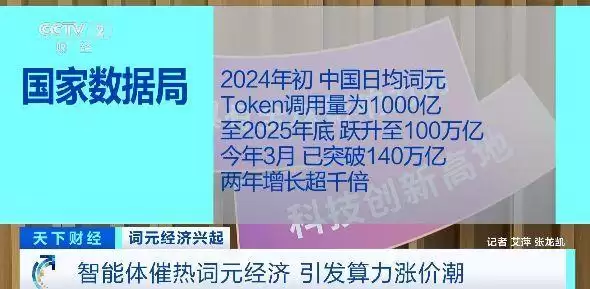 国家数据局发布的数据显示:2024年初,中国日均词元Token调用量为1000亿;至2025年底,跃升至100万亿;今年3月,已突破140万亿,两年增长超千倍。