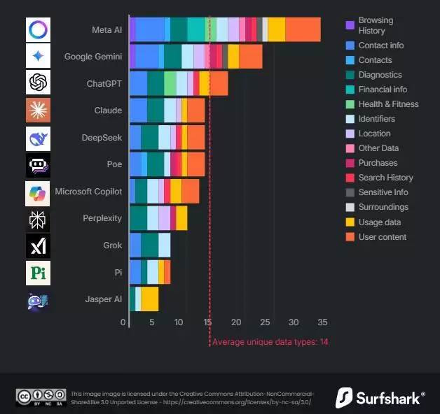 按照苹果应用商店的 35 种数据分类标准,AI 应用平均收集 14 种用户数据。而 Meta AI 收集多达 33 种数据,占比约 95%,是唯一获取用户财务信息的 AI 应用,还会收集种族、性取向、政治观点等极度敏感信息。谷歌 Gemini 收集 23 种数据,数据涵盖精准位置与设备通讯录等。