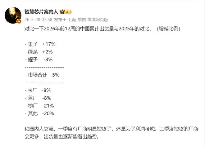 不信我们可以看行业人士“智慧芯片案内人”提供的,2026年前12周国内主流六大品牌,同比2025年的数据。数据显示苹果同比是增长17%,OPPO系同比增长2%;荣耀同比下降3%,华为同比下降8%;vivo同比下降8%,小米同比下降21%。而这一时期整体市场同比下降5%,这就是为何他把苹果、OPPO系、荣耀排在第一梯队的原因所在。因为这三个品牌的整体表现超过了平均线,而华为、vivo、小米整体表现都没有达到平均值水平。需要说明的是国内主流六大品牌在前12周仅苹果、OPPO系同比是增长的,剩下的四个同比全部在下跌。其它类品牌更惨,同比下跌达到20%。