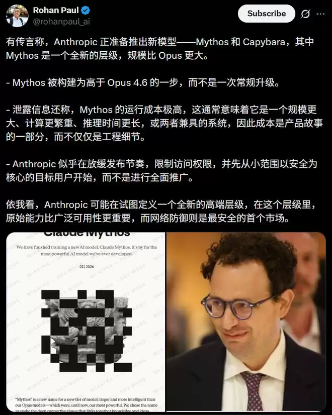 Stifel分析师Adam Borg看完泄露内容后直言:Mythos显然比市面上任何前沿模型都要强大一个数量级,且算力消耗极高。