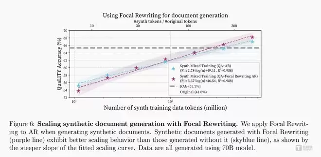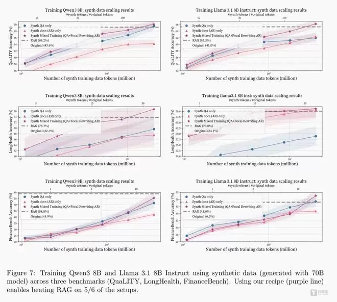 这支顶尖团队最初也遭遇了同样的瓶颈。在多轮测试中,单纯使用合成问答对、或是仅用合成文档训练模型,性能提升都极为缓慢,即便加大数据投放量,效果也会快速触顶,甚至比成熟RAG方案低4.6%。