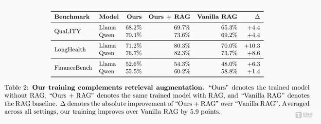 这套组合策略,交出了亮眼的成绩单。论文实验数据显示,在长文本理解(QuALITY)、医疗专业问答(LongHealth)、金融分析研判(FinanceBench)三大权威测试场景中,通过SMT与Focal Rewriting组合策略微调的模型,实现了对传统RAG的超越,在QuaLITY数据集上领先幅度高达4.4%。更具实用价值的是,将SMT训练后的模型与RAG结合使用,性能可在原有基础上再提升9.1%,实现双重增效。