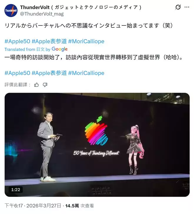 此外,苹果同日还在日本东京表参道的 Apple Store 举行特别活动,Hololive 虚拟主播(IT之家注:VTuber)“森美声”通过门店的屏幕进行现场表演。