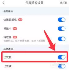 点击“包裹到站通知”后面的开关,将其打开。开关颜色变为蓝色,表示已成功开启。