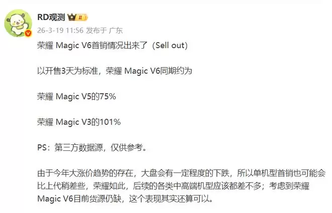荣耀Magic V6首销三天达到了上一代荣耀Magic V5同样开售三天的75%,是上上一代荣耀Magic V3同样开售3天的101%。针对这个销量行业人士认为今年情况非常特殊 ,整体市场会有一定程度的下跌,且荣耀Magic V6有很多版本都在缺货中,所以这个表现还是不错的。