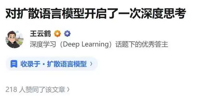 而作为知乎深度学习话题的优秀答主,王云鹤也经常分享他对于 AI 核心架构等话题的见解。比如在今年 1 月 24 日,他在个人知乎账号上发布了题为「对扩散语言模型开启了一次深度思考」的文章。在这篇文章中,他深入探讨了扩散语言模型在文本生成领域的潜力与面临的技术瓶颈。