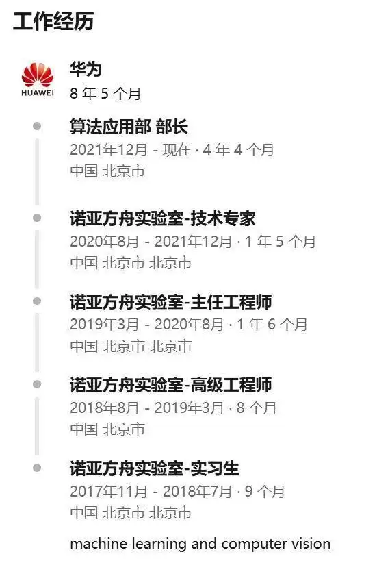 他从北京大学毕业前便已经在华为诺亚方舟实验室实习,毕业之后也自然加入其中,担任高级工程师,之后陆续升任主任工程师和技术专家。