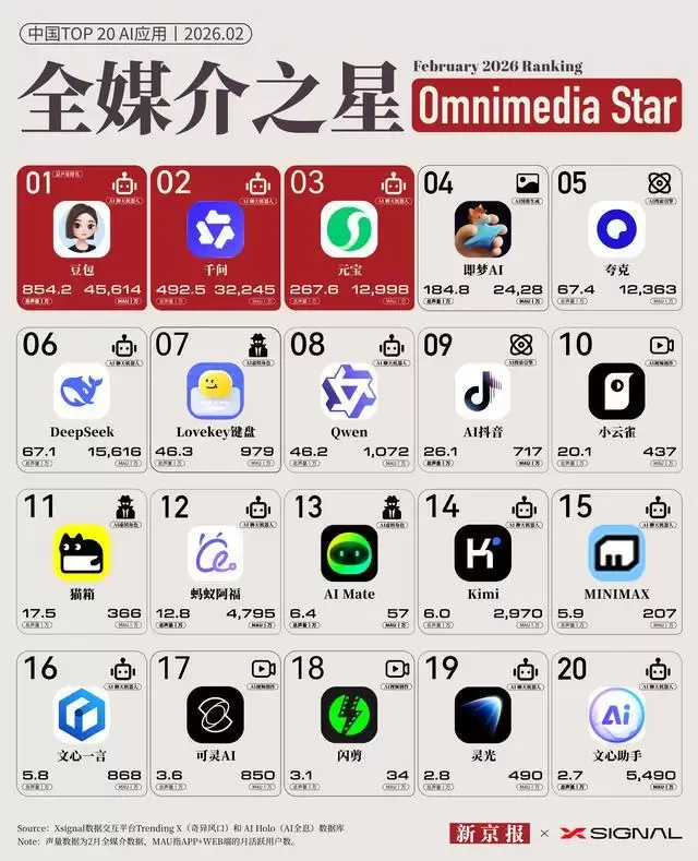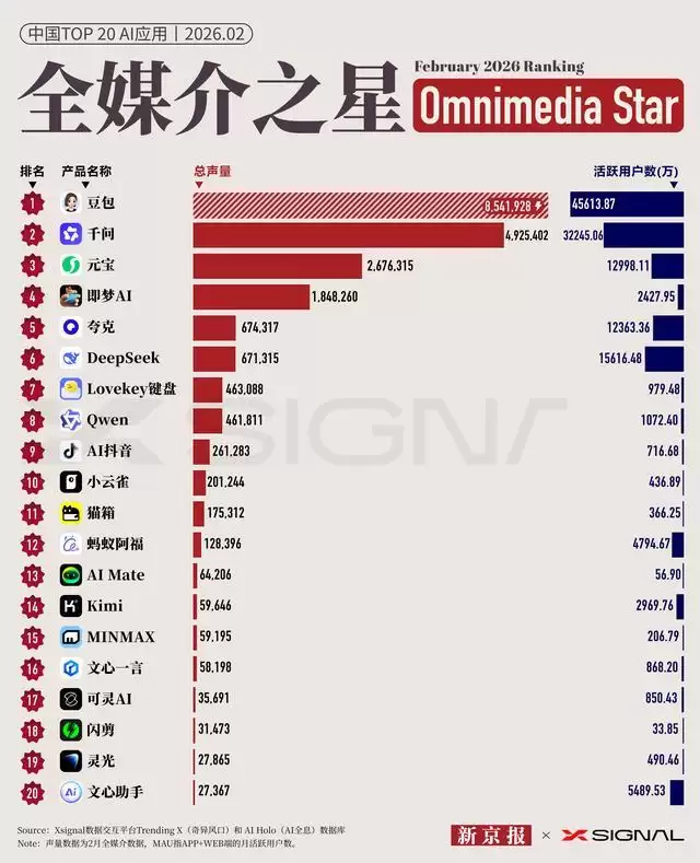 “全媒介之星”榜单由新京报AI研究院与Xsignal联合编制,依据全媒介声量评出2026年2月国内最具影响力的20款AI应用。榜单采用双指标呈现:左侧红色柱状图代表全媒介声量(基于用户在新闻、社交、短视频、垂直社区及财经等800余个平台的内容生成量测算),反映市场关注度与潜在增长空间;右侧蓝色柱状图显示月活用户(MAU)数据,体现AI应用当期的实际用户规模与活跃度。