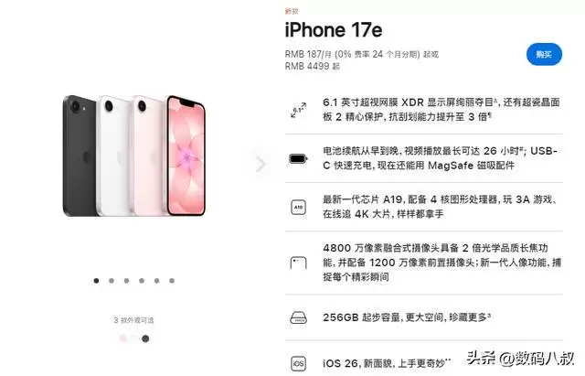 iPhone 17e 作为 iPhone 17 系列入门款,起步存储直接拉满 256GB,国行售价 256GB 版 4499 元、512GB 版 6499 元,提供黑、白、浅粉三色。核心搭载 A19 芯片与 C1X 调制解调器,性能较 A18 提升 25%,功耗降低 18%,日常使用流畅度大幅提升。4800 万像素融合式主摄支持 2 倍光学品质长焦,6.1 英寸超视网膜 XDR 屏配超瓷晶面板 2,抗刮划能力较前代提升 3 倍,户外可视性更强。