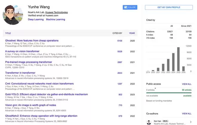 其代表性论文包括CVPR 2020的《GhostNet: More features from cheap operations(GhostNet:用更低成本计算获取更多特征)》(GhostNet:用更低成本计算获取更多特征),引用超过6000次,以及TPAMI 2024的《A survey on vision transformer(视觉Transformer综述)》(视觉Transformer综述),引用超过5000次。