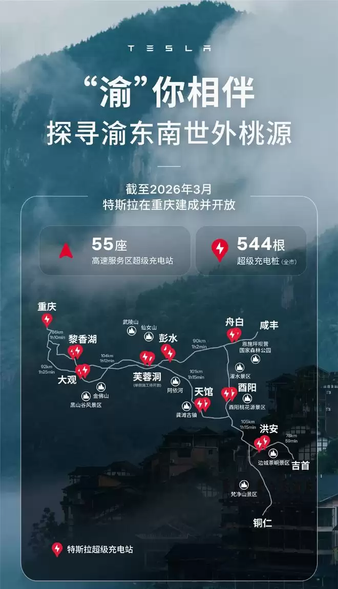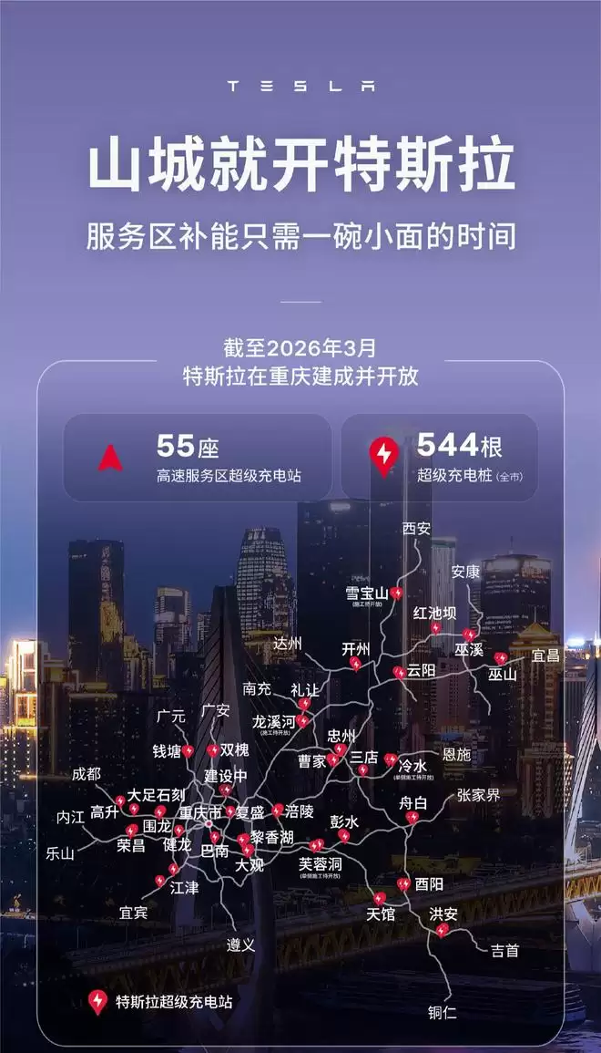 重庆高速服务区已建成55座特斯拉充电站,覆盖全省