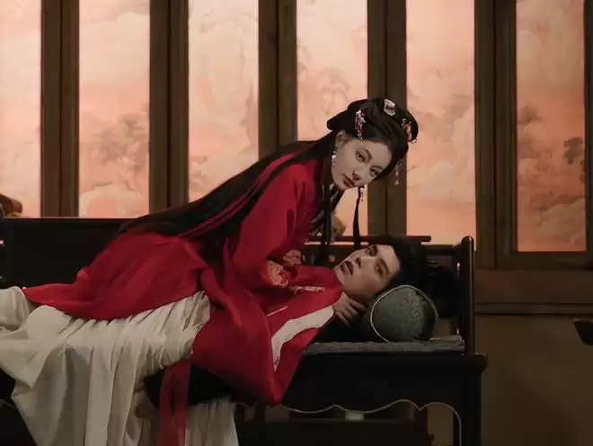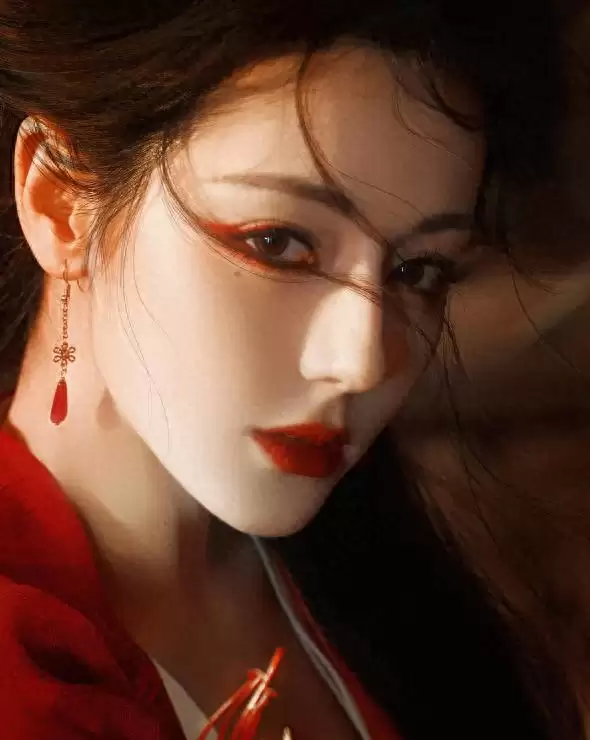 她饰演的鬼王贺思慕,红衣白发配紫瞳,身上穿的重工刺绣红袍镶满了仿古琉璃珠,走路时珠玉轻响,还特意设计了“飘滑步伐”,没有一点凡人的烟火气。