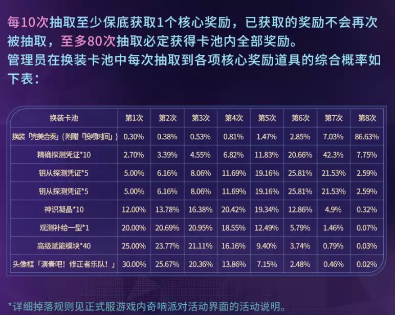 4周年登录就送移转之辉3000和限时精确探测凭证10个让你直接白嫖基础探测次数,使你快速的抽取到自己想要的道具。还可以通过完成日常任务,版本活动,览宙合版本任务、活跃度奖励等内容额外获取转移之辉。抽取建议必拿优先级,不灭王权·荷鲁斯完美合奏>主界面场景少女欢奏之夜。