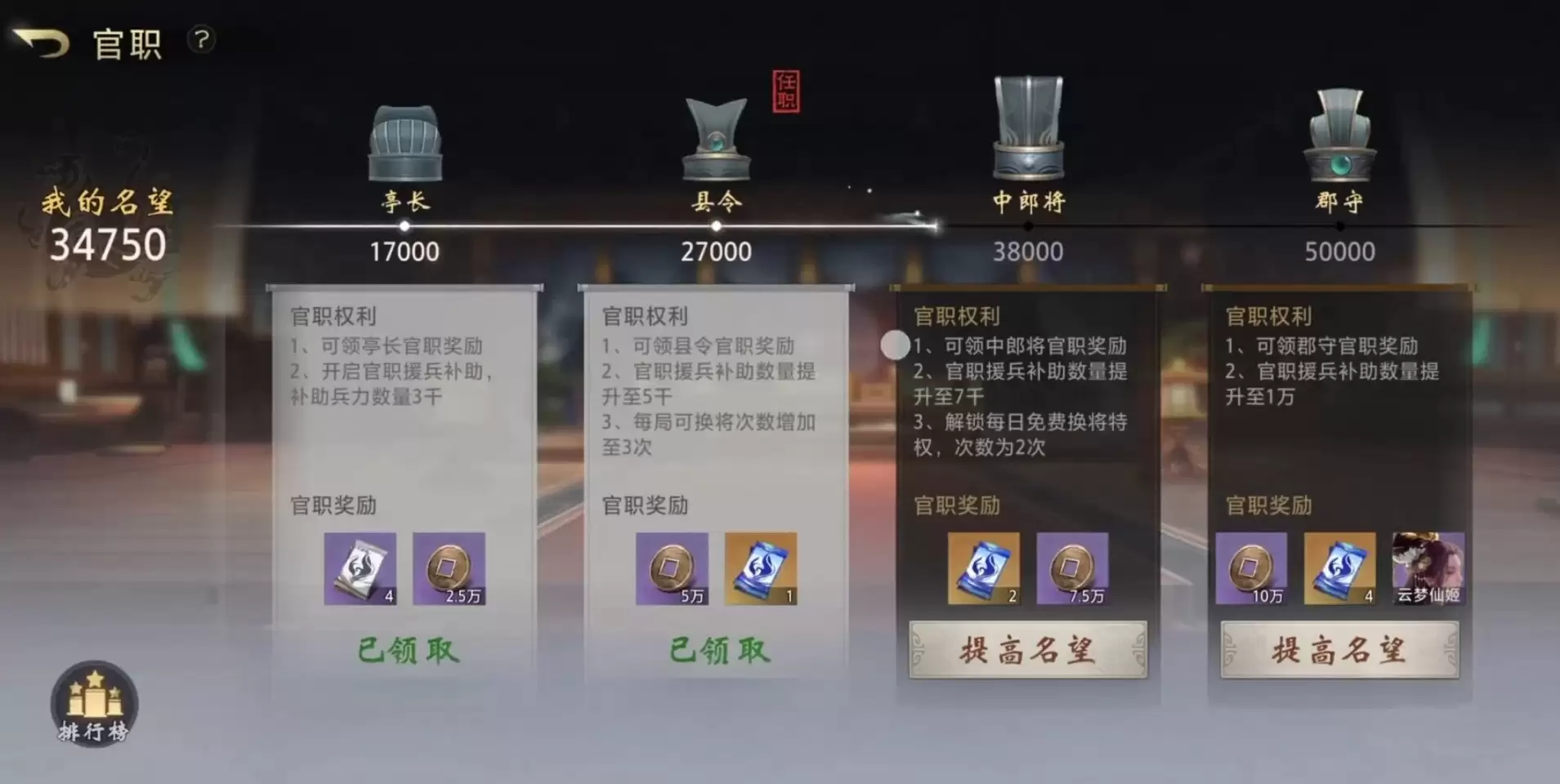 如果玩家还想要获取更多的兵力,可以尝试进阶兵力获取方法。玩家完成每天的锦标赛和每三天进行一次的问鼎九州活动,也可以获取兵力。挑战的比赛层级越高,获得的兵力奖励就越丰厚,但是新手或许有些吃力。玩家参加加官进爵活动,也可以获得一次性的兵力奖励。