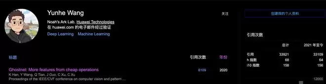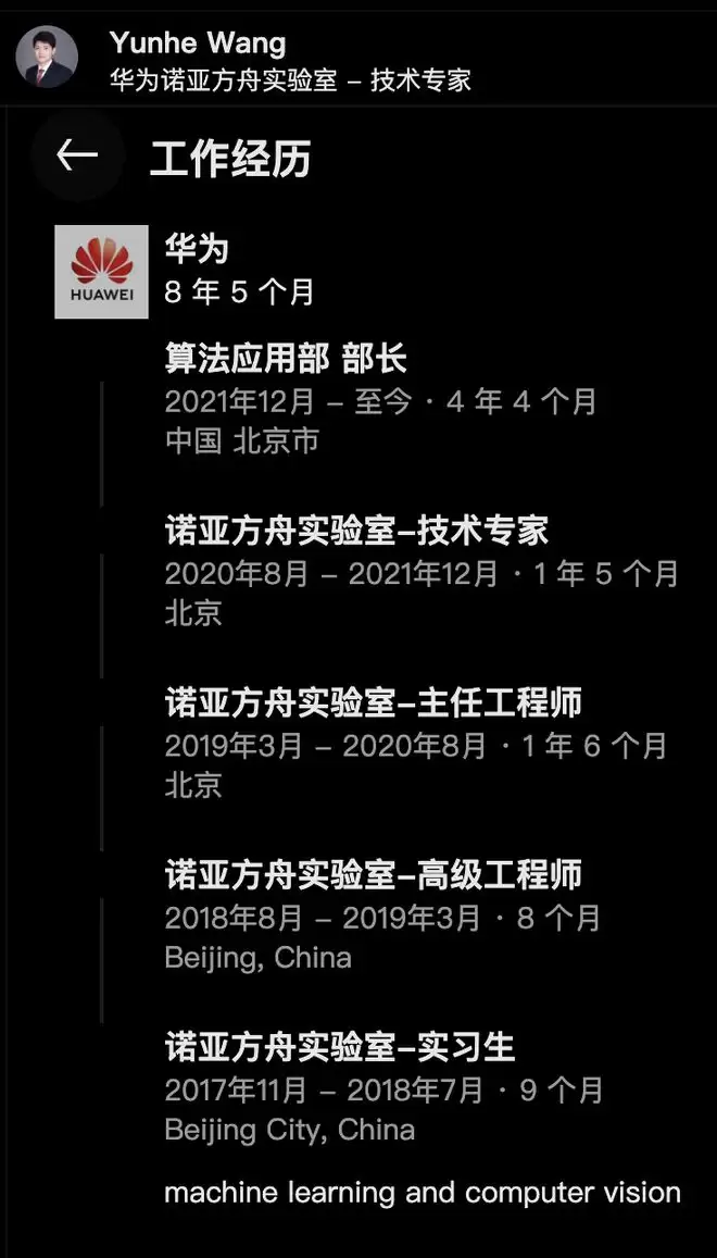 博士毕业当年,王云鹤正式加入华为诺亚方舟实验室,担任高级工程师,并于 2020 年开始担任该实验室技术专家。