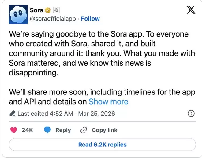 2026年3月24日,OpenAI宣布关停Sora。